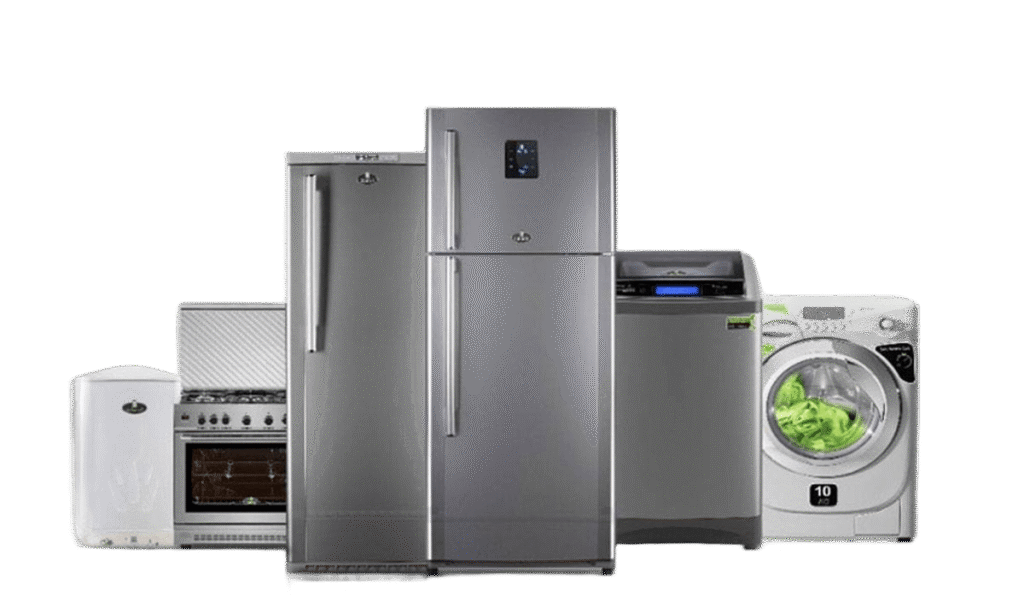 غسالة الاطباق، الثلاجة، الديب فريزر، مجفف الملابس، البوتاجاز، افران بلت ان، الميكروويف، تكييف الهواء.